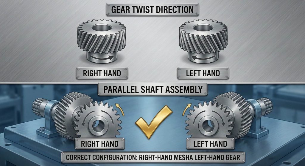 Correct hand matching is the most basic yet vital step in ensuring that helical gears mesh correctly within a parallel shaft arrangement.