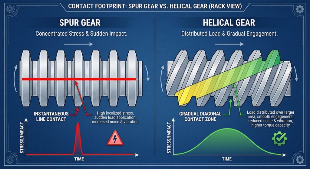 Gradual engagement means that the total force is spread across a wider surface area. This reduces localized stress at the tooth root, effectively extending the fatigue life of your components.