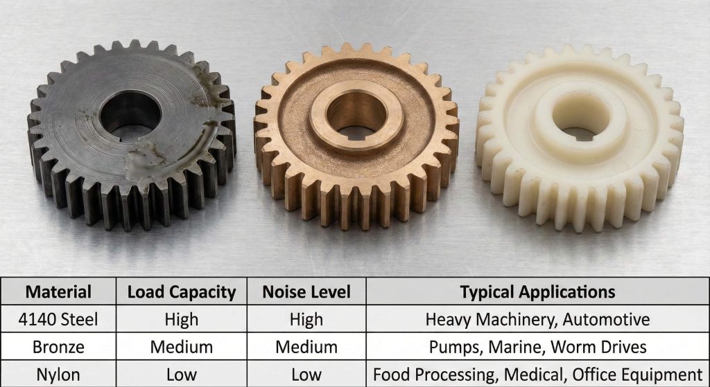 High-strength alloy steels like 4140 are the best materials for every spur gear tooth because they respond well to heat treatment. Selecting the right material depends on specific torque requirements and the environmental conditions of your application. Engineering polymers like nylon are excellent for low-load applications where noise reduction and weight are your primary concerns. You must match the material hardness to the operating environment to prevent premature wear from corrosion.