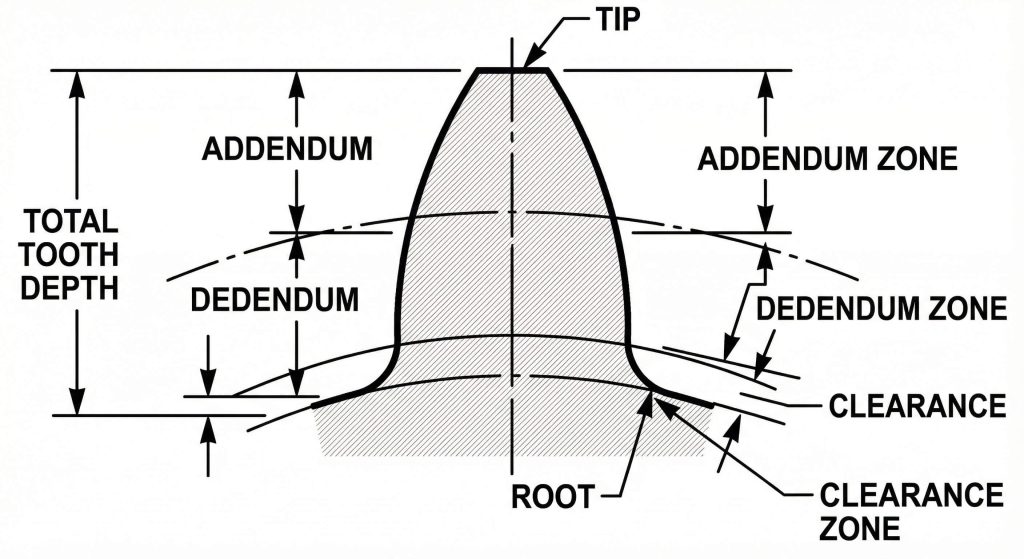 The geometric zones of a spur gear tooth include the addendum and dedendum which define the total depth and engagement characteristics. The addendum extends outward from the pitch circle to the outer tip of the tooth structure. The dedendum represents the portion extending inward from that same reference line toward the root diameter. Total depth must accommodate the mating component without physical interference during full engagement cycles.
