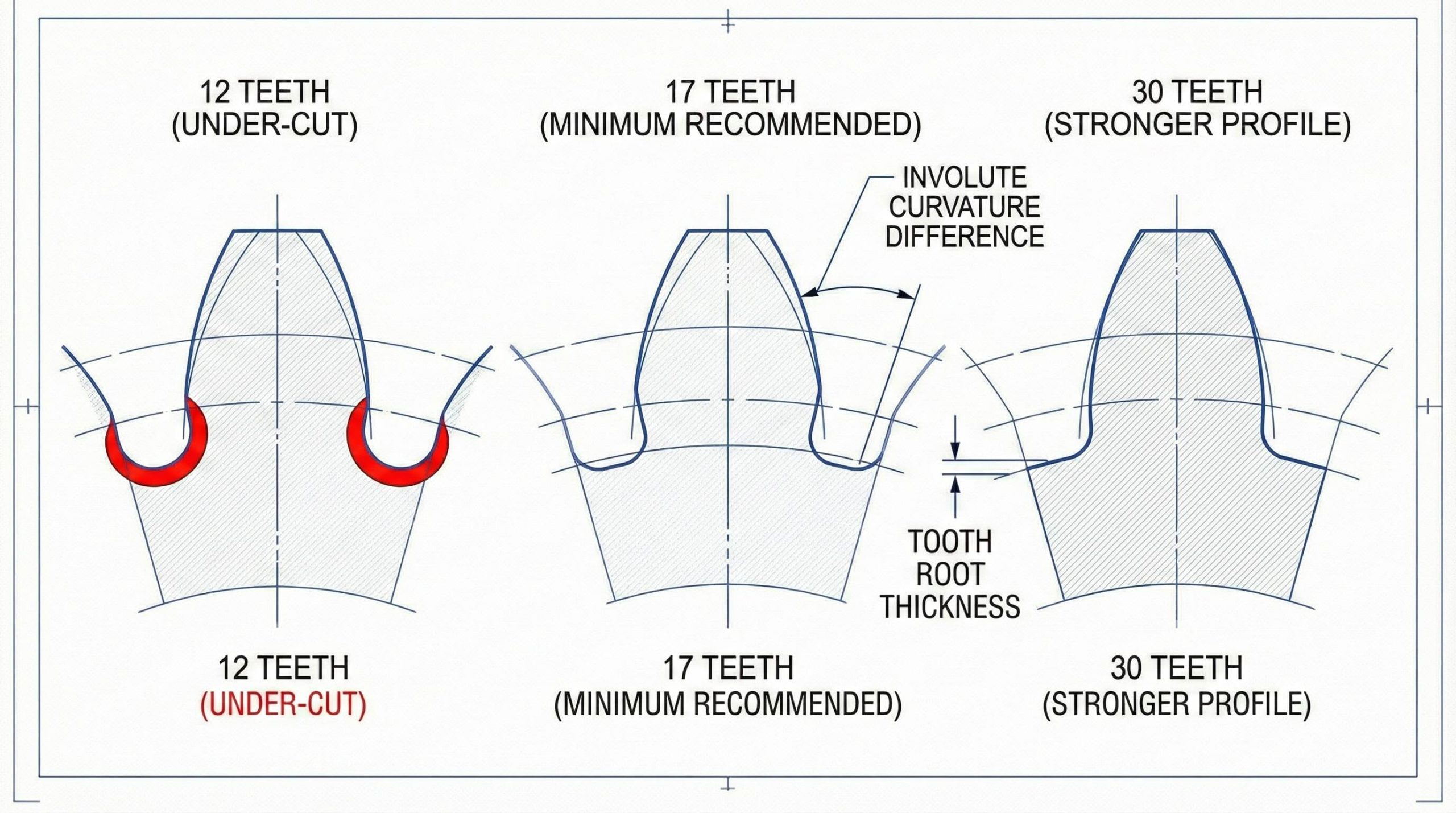 The tooth count affects spur gear tooth curvature by determining the final physical size and the shape of the involute profile. As the count decreases, the profile becomes more curved which can lead to a phenomenon known as undercutting. Undercutting removes material from the base which severely weakens the structural integrity of the gear component. Most designers maintain a minimum of 17 teeth for standard 20-degree pressure angle components to avoid these issues.