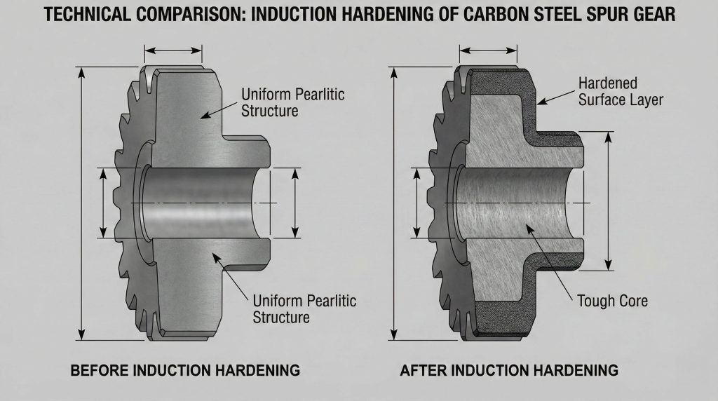 Induction hardening is the most cost-effective method for increasing the surface durability of carbon steel spur gears. It targets only the tooth flanks, keeping the core of the gear ductile and the processing costs low.