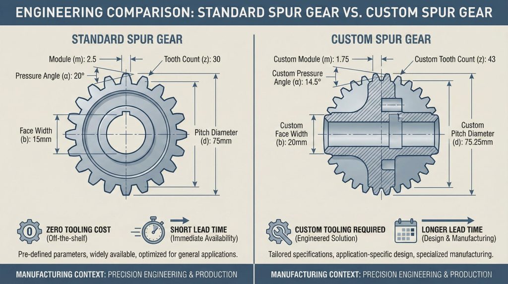 Choosing off-the-shelf dimensions avoids the massive premiums associated with custom tooling for your spur gear materials. Standard modules and pressure angles are produced in high volumes, driving the unit price down for everyone.