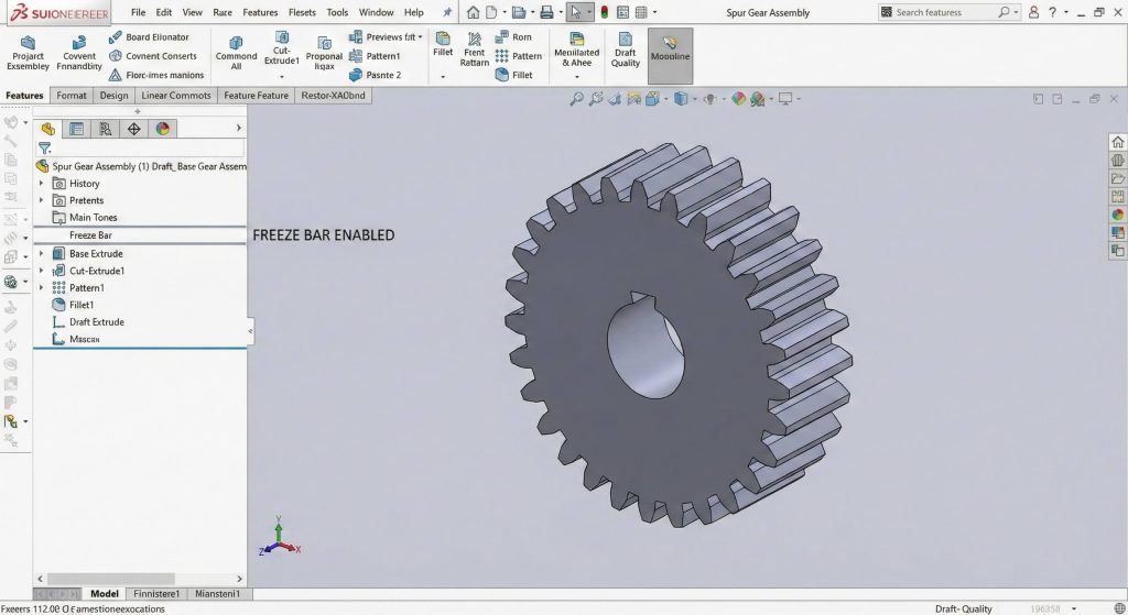 Optimizing performance involves freezing the feature tree once your high-fidelity spur gear model reaches its final design state. CAD programs often struggle to recalculate hundreds of complex involute faces during assembly rotations or drawing creation. What is the catch? While freezing helps, you must remember to unfreeze the bar if you need to make further parametric changes.