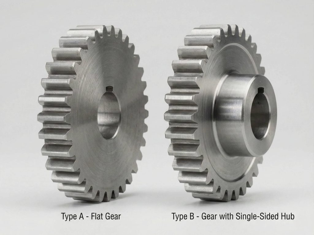 Type A gears are simple flat discs that work best when you have extremely limited axial space within a housing. Type B gears feature a protruding hub on one side, which provides more surface area for a robust keyway attachment. You will find that Type B is the industry standard for most general-purpose mechanical transmissions.