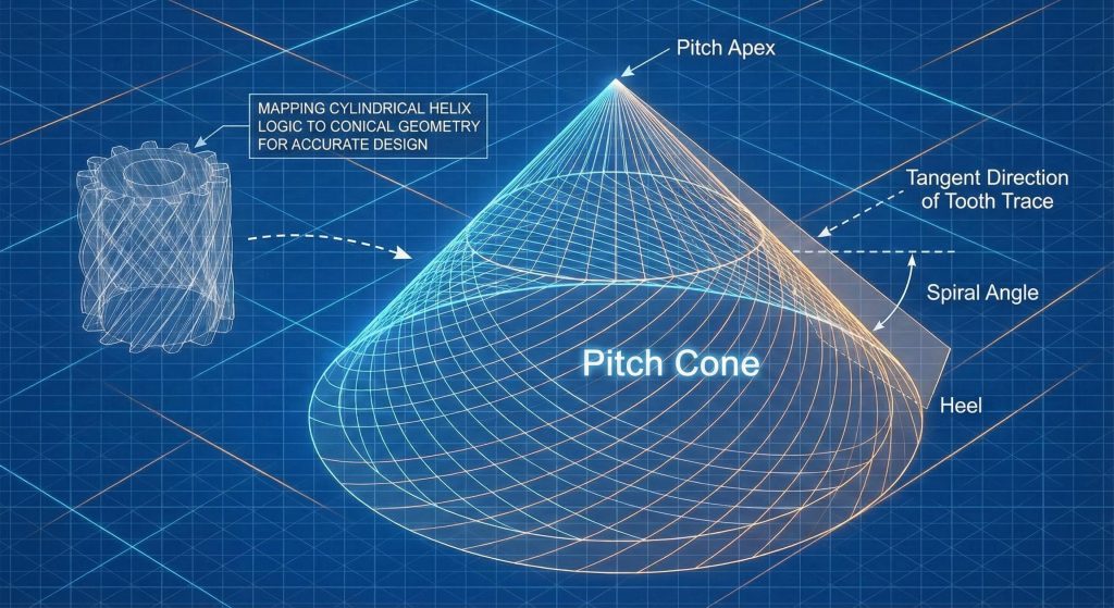 Bevel gear geometry is unique in a helical gear design calculator because the teeth are tapered and converge toward a central pitch apex. You are essentially working with the surfaces of intersecting cones rather than cylinders, which changes every dimensional reference point.