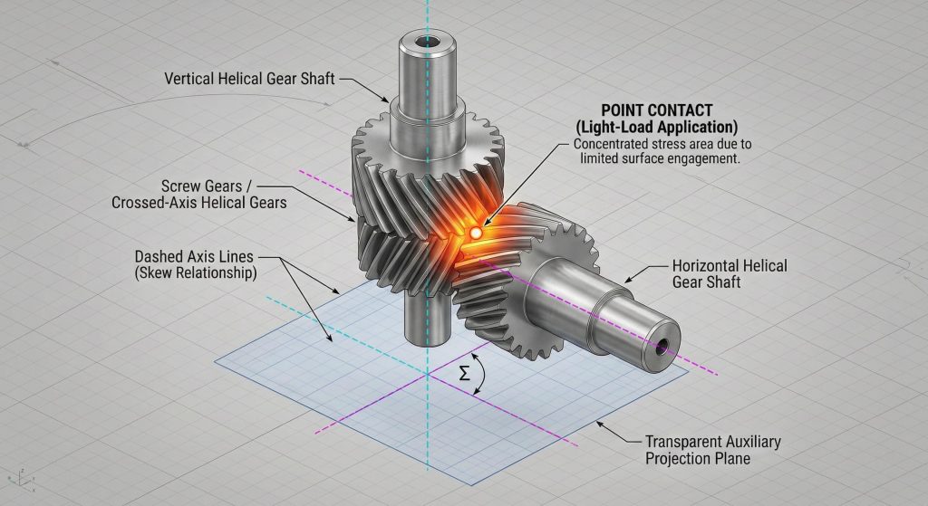 Key Takeaway: Crossed helical gears use identical normal modules to connect skew shafts at virtually any angle.