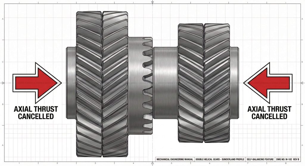 Key Takeaway: Double helical gears provide superior power density by mechanically cancelling out problematic axial thrust forces.