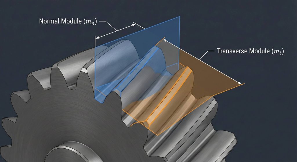 - Transverse Module ($m_t$): This is measured in the plane of rotation (the face of the gear). It is used to calculate the pitch diameter.