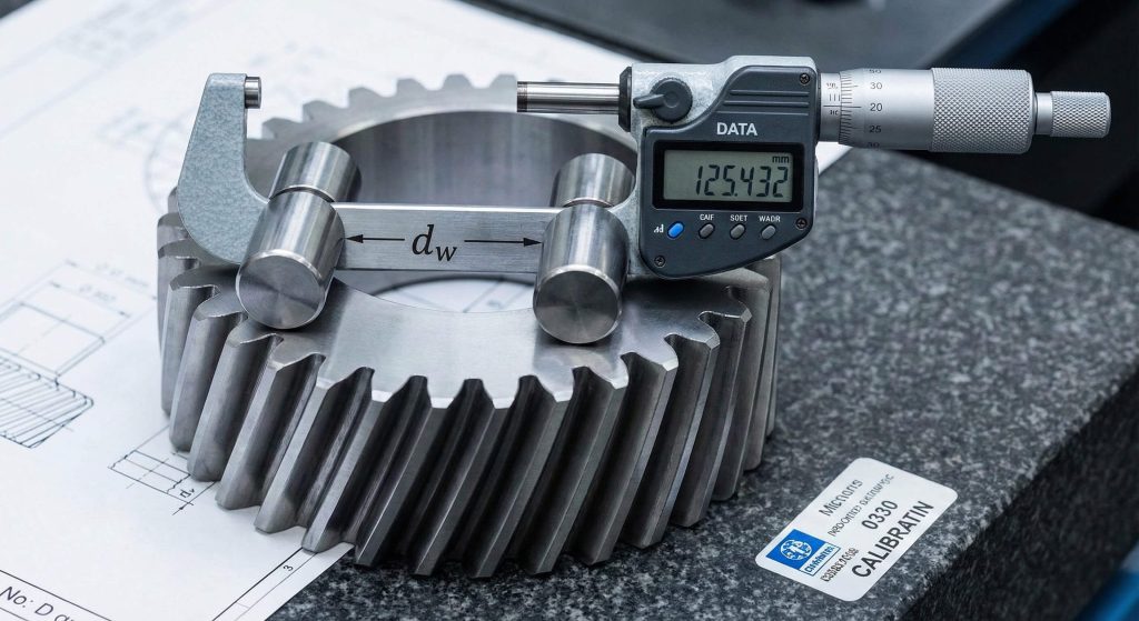 - Over-Pin Diameter ($d_w$): Precision pins are placed in the tooth gaps, and the distance across them is measured.