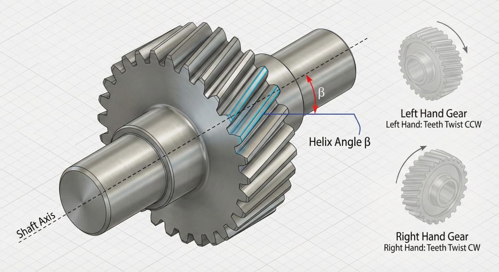 Key Takeaway: The helix angle is the “engine” of the gear’s performance; higher angles provide smoother motion but generate more side-loading (thrust).