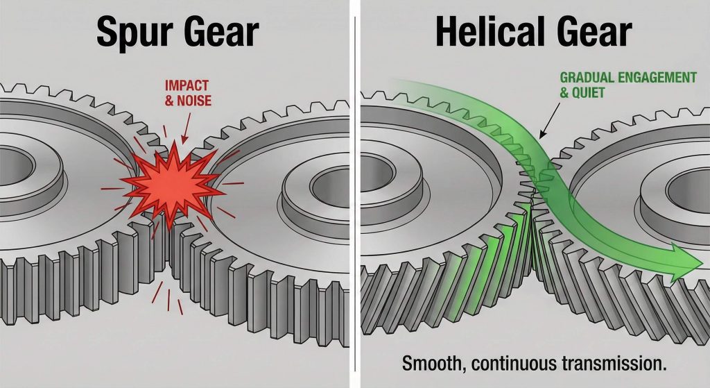 - Noise Reduction: The overlapping tooth engagement dampens the “clatter” typical of straight-cut gears.