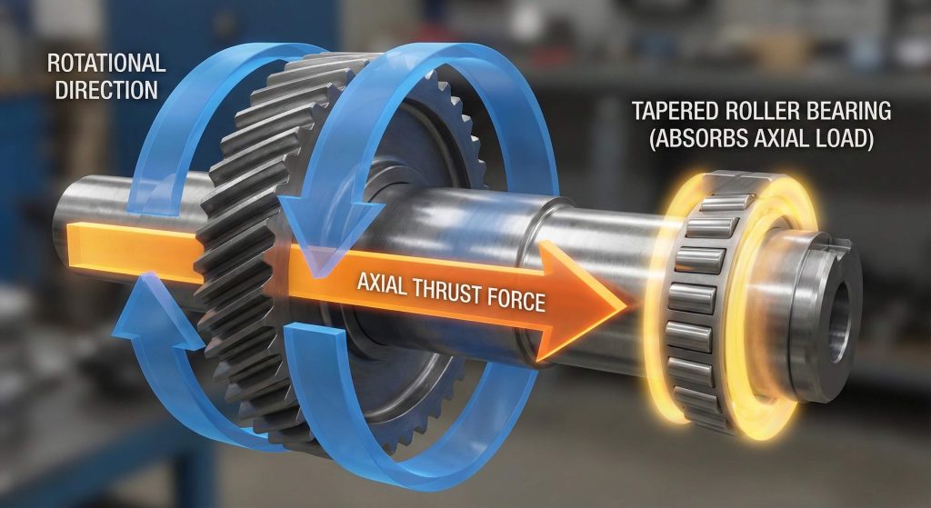 Your gearbox requires thrust bearings because the angled tooth profile generates a side-loading force along the shaft that standard radial bearings cannot support without failing.
