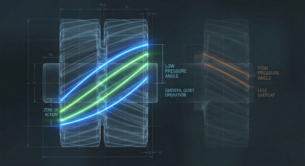 Key Takeaway: Lower pressure angles provide quieter operation by increasing the average number of teeth in simultaneous contact.
