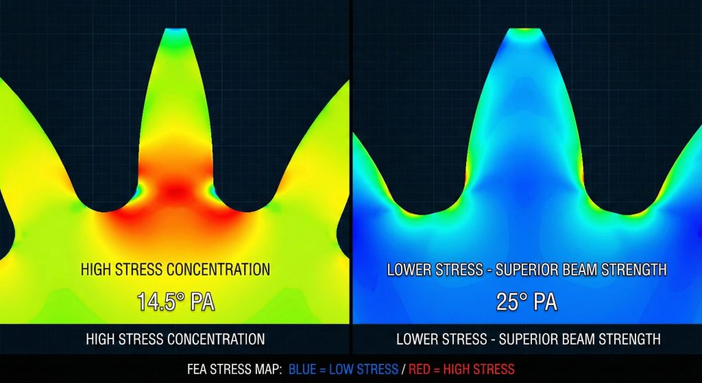Key Takeaway: Higher pressure angles increase tooth strength but significantly raise the load on supporting shafts.