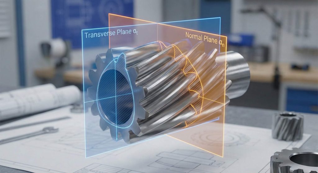 You must distinguish between the normal and transverse pressure angle of helical gear because they represent the geometry in two distinct planes of measurement. The normal pressure angle ($\alpha_n$) is measured in a plane perpendicular to the tooth helix, while the transverse pressure angle ($\alpha_t$) is measured in the plane of rotation.