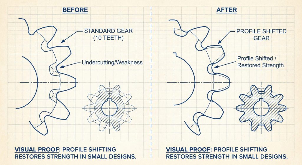 Key Takeaway: Profile shifting allows you to optimize tooth strength and prevent manufacturing defects in small-diameter gears.