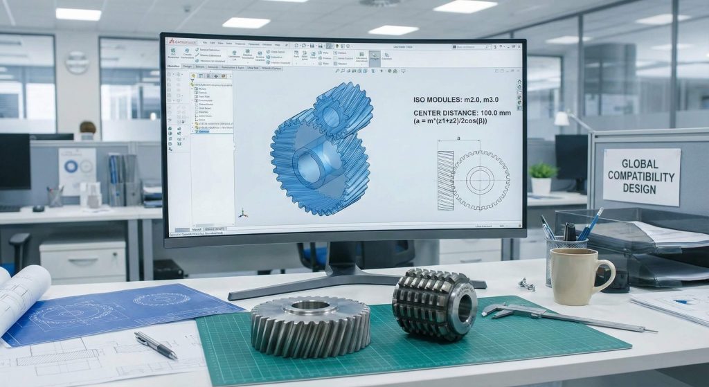 Center distance is directly calculated from the transverse module and tooth count to ensure the gears operate on their theoretical pitch lines. Even small deviations in the module can lead to improper contact and localized tooth overheating.