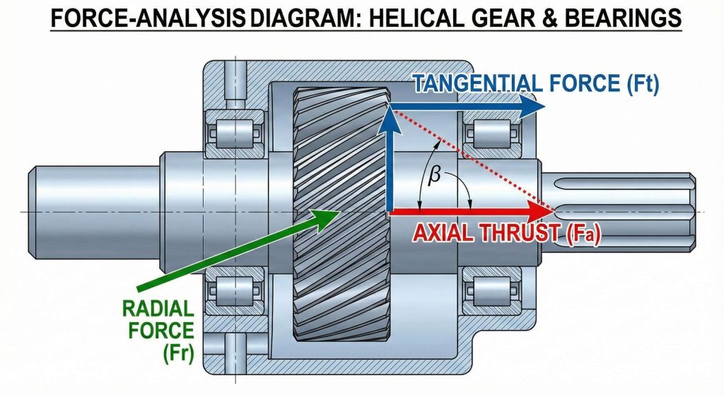 The helical gear calculation formula estimates axial thrust by calculating the forces acting parallel to the gear shaft axis. But here’s the kicker. This thrust load depends directly on the tangent of the helix angle multiplied by the transmitted load on the teeth. You will find that increasing the helix angle dramatically increases the axial force acting on your shaft supports.