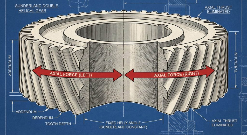 Key Takeaway: Sunderland double helical gears provide a thrust-free solution for massive torque requirements by utilizing fixed helix angles.