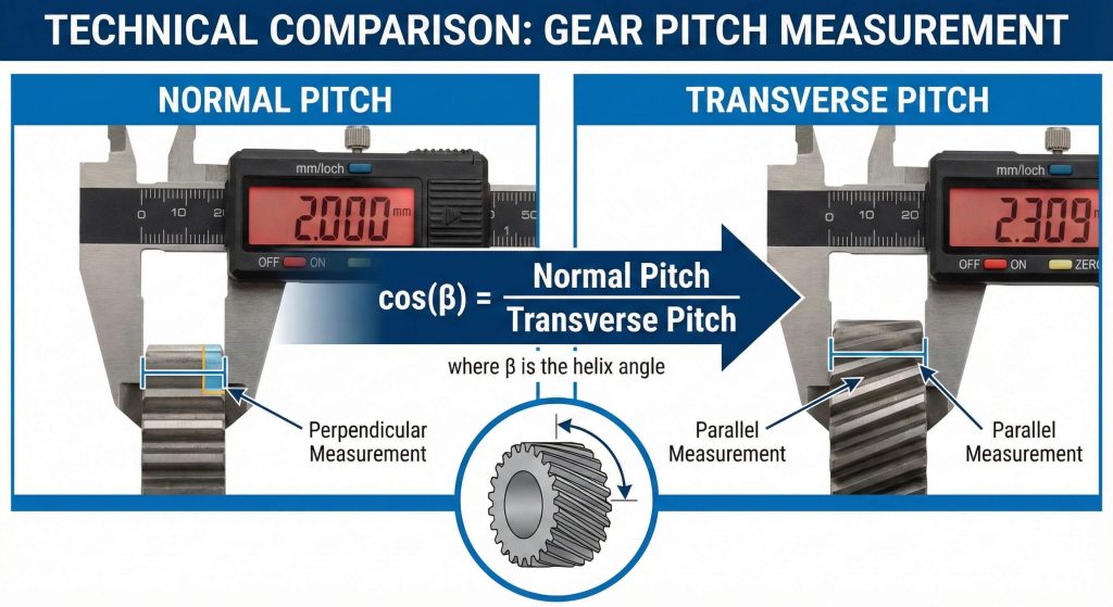 You use digital calipers to measure the transverse and normal pitch of the gear teeth. This method for how to measure helix angle of helical gear relies on the difference between the tooth thickness measured at different planes. The cosine of the angle is the ratio of the normal pitch to the transverse pitch.