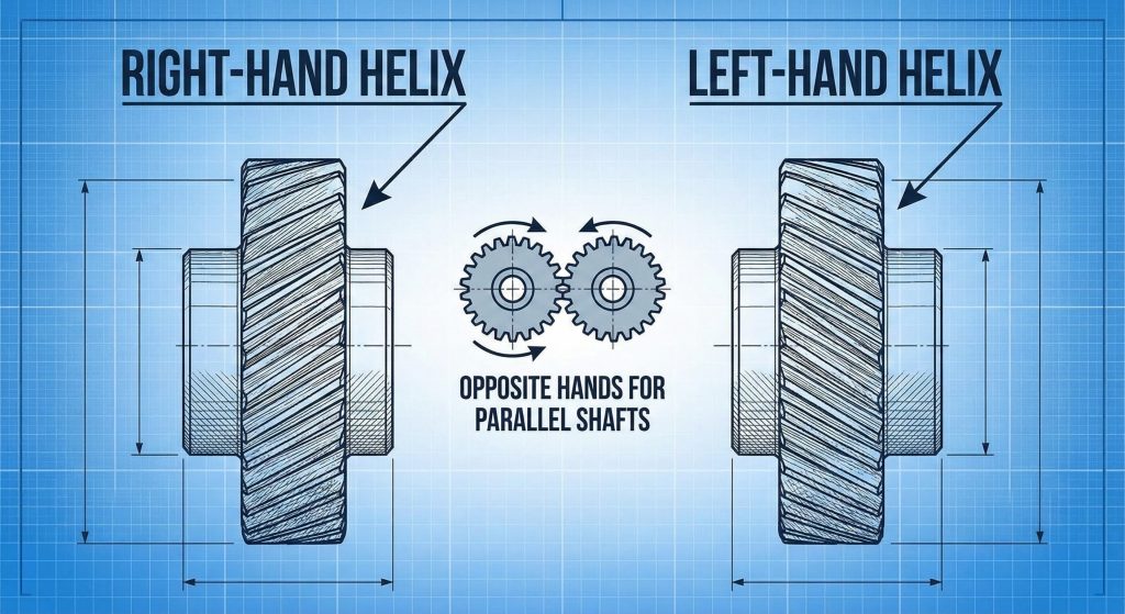 Key Takeaway: Identifying the “hand” of the gear is just as important as the angle itself for proper mechanical assembly.