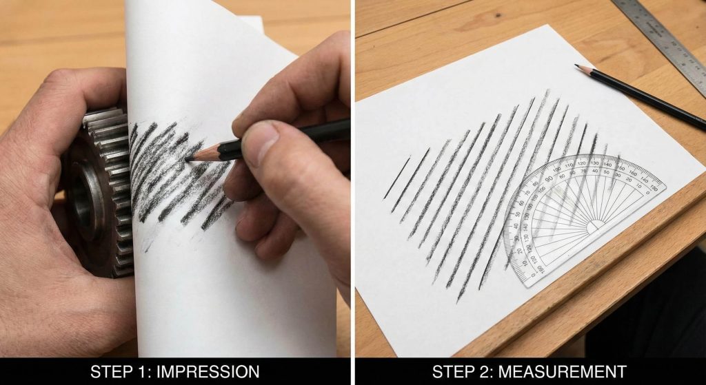 You wrap a piece of paper around the gear and rub a pencil over the teeth to create a trace. This manual technique for how to measure helix angle of helical gear translates a 3D surface into a 2D geometric map. Once the paper is flat, you use a standard protractor to measure the angle of the resulting parallel lines.