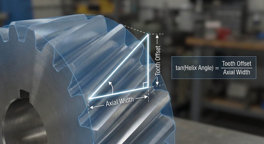 You use basic trigonometry by measuring the axial width and the tooth’s horizontal offset across the face. Finding how to measure helix angle of helical gear starts with defining a right triangle on the tooth flank. You then apply the arctangent formula to the ratio of the offset over the axial thickness to find the degrees.