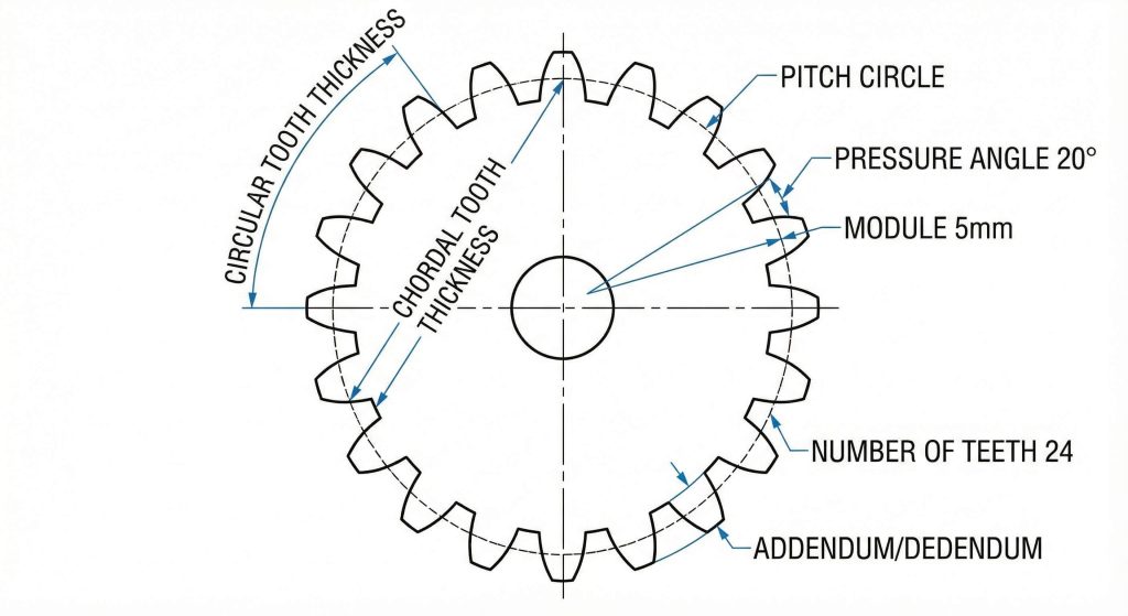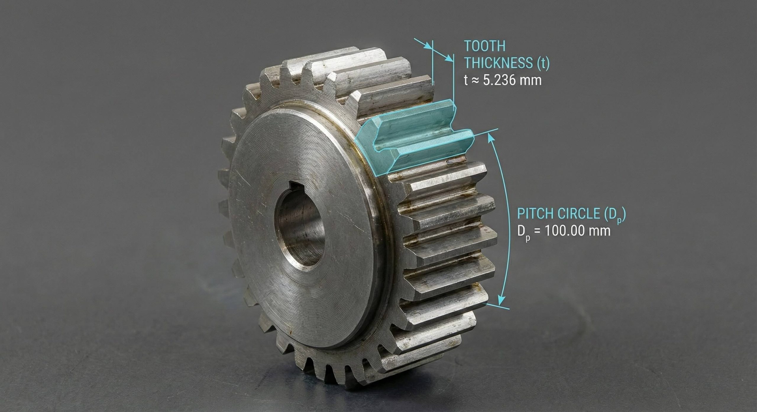Key Takeaway: Standard thickness calculations always anchor to the pitch circle to maintain consistency across different gear sizes and modules.
